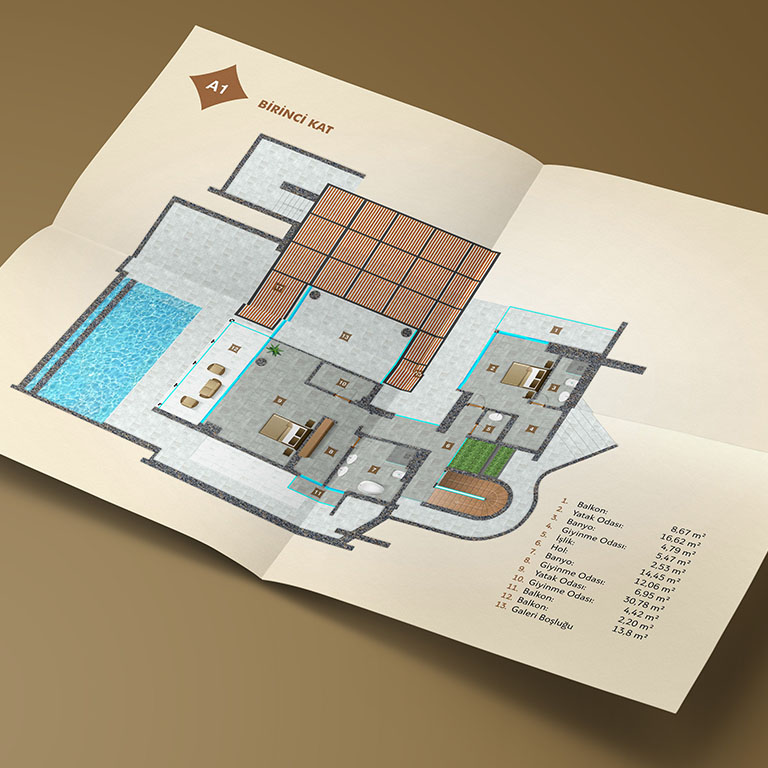 Twenty-three unique houses designed with a perfect synthesis of wood, glass and natural stones, varying in size between 400 m2 and 800 m2, each offering an individually matchless life with breath-taking nature and architectural concept, terraces commanding the marvelous Yalıkavak view, and private pools; all located in a way that makes each house invisible to the other with awe inspired respect to nature. Car parks were relocated to underground spaces to prevent disruption of the landscape above and to create a serene atmosphere away from the noise of traffic.